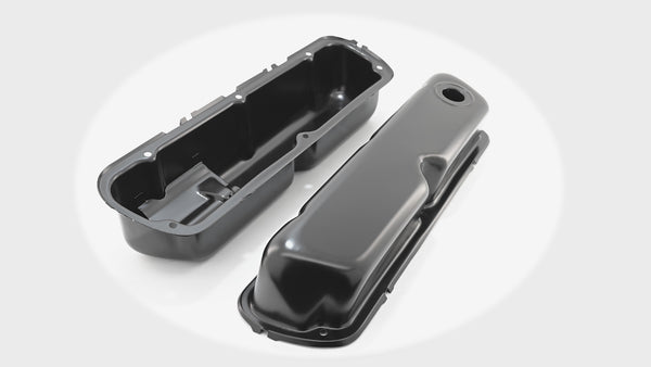 Steel smooth valve covers designed for 1962–1985 Ford small block 260, 289, 302, and 351W engines. Stock 3-1/2" height with stamped steel construction and smooth top design. Finished in durable black. Includes internal oil-control baffles and one 1.25" push-in breather hole per cover. Perimeter-bolt mounting. Sold as a pair.