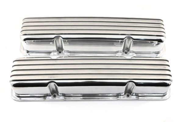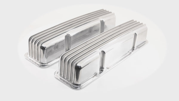 Constructed from high-quality die-cast aluminum, these covers provide strength without excess weight and feature a high-luster polished finish that enhances any engine bay. The tall-profile design (approx. 3.75") accommodates most aftermarket roller rockers and stud girdles. With a no-hole solid top, these covers are ideal for custom breather setups, racing applications, or builders seeking a clean, uninterrupted finned appearance.