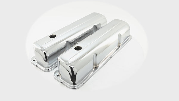 Each valve cover is built from high-quality stamped steel and finished in high-luster chrome for corrosion resistance and lasting shine. They are made to stock height (3-7/8") to ensure proper clearance and compatibility with most OEM-style components. Both covers include one 1.25" push-in breather hole and internal baffling to help reduce oil splash and improve crankcase ventilation.